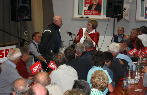 Dann klare Aus- und Ansagen. Immer noch stehe er hinter Schröders Agenda-Politik. Auch wenn sie der SPD viele Stimmen gekostet habe. Die Sozialdemokraten müssten darauf achten, weiter Regierungsverantwortung zu übernehmen: „In der Opposition werden wir uns nicht erholen, Opposition ist Scheiße, da kannst du nichts bewegen.“ Was ihm später in kleiner Runde den Widerspruch des Landtagsabgeordneten Dr. Christoph Rabenstein einbrachte, in Bayern komme die SPD mit dieser Rolle gut zurecht. „Da sind wir unterschiedlicher Ansicht“, konterte Struck knapp und trocken.