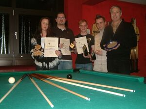 Das Team der Pegnitzer SPD konnte bei der 1. Pegnitzer Stadtmeisterschaft im Billard den Titel in der Mannschaftswertung feiern. Das Team um Doris Steffel- Förster, Oliver Winkelmaier und Uwe Raab ließen das Trio der Pegnitzer Polizei mit unserem SPD- Mitglied und Stadtratskollegen Werner Mildner hinter sich. Zudem erreichte Oliver Winkelmaier einen tollen dritten Rang in der Einzelwertung. Für den Erfolg in der Mannschaftswertung wurde dem SPD- Team eine Sieger- Schale und Oliver Winkelmaier für seinen dritten Platz im Einzel ein Pokal überreicht.